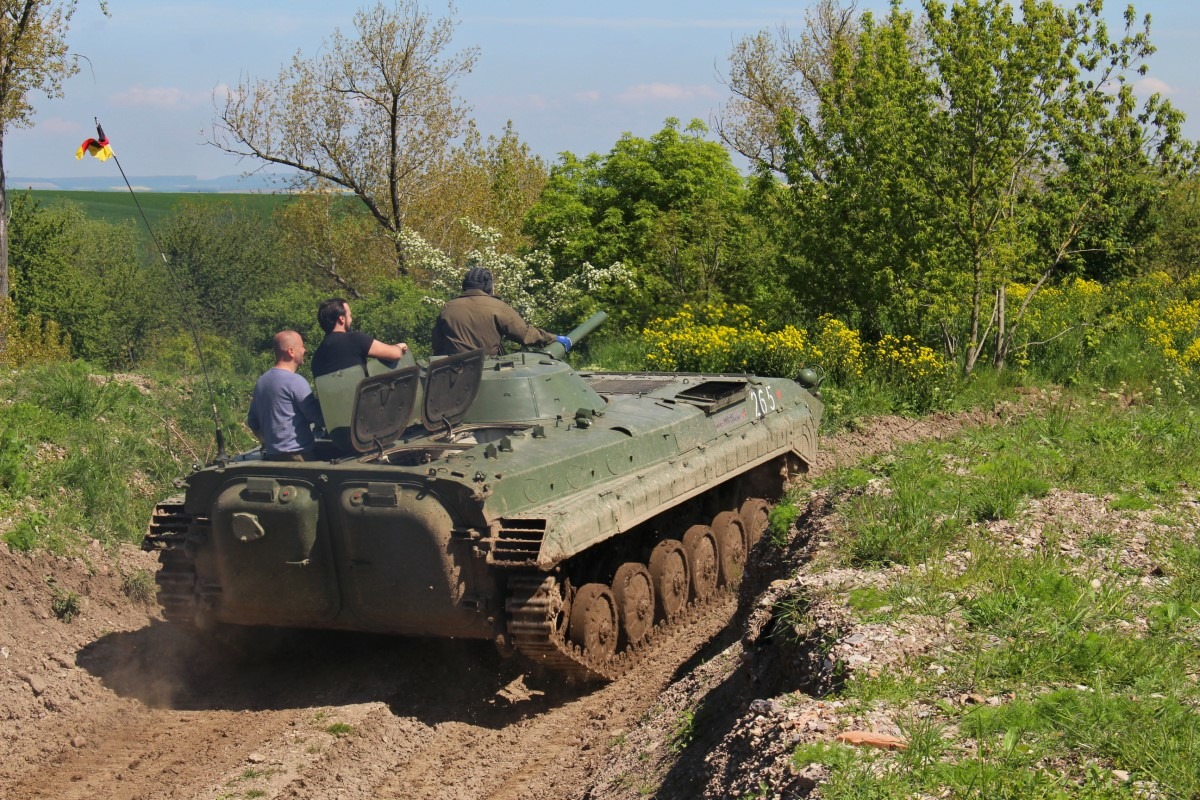 Der BMP ist ein gepanzerter Mannschaftstransporter, bei dem 3 Besatzungsmitglieder (Fahrer, Kommandant & Richtschütze) und 8 weitere Mitfahrer Platz haben. Die Mitfahrenden haben die Möglichkeit aus Luken im Dach zu schauen und die wilde Fahrt zu genießen. Durch die Schnelligkeit, Wendigkeit und Schwimmfähigkeit des Kettenpanzers ist er ein Multifunktions-Talent und die Bestreitung des Parcours macht noch mehr Spaß.